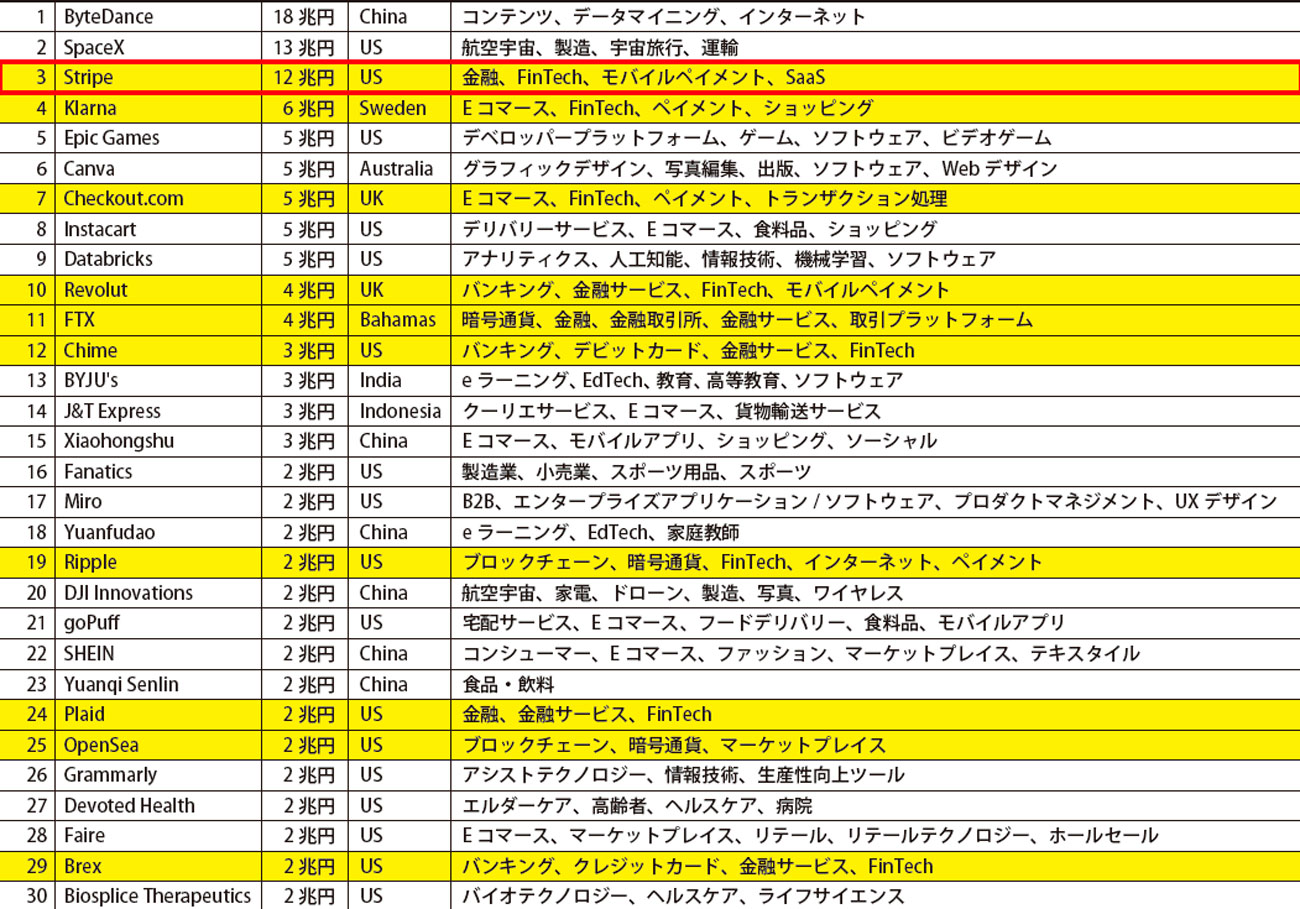 金融の分野では、Appleと提携して一般消費者向けに「Apple Card」の提供を開始した金融大手Goldman Sachsの動きもあるが、10兆円級の「Stripe」や1.7兆円級の「Plaid」など、金融ユニコーンの話題も尽きない。2023年時点のユニコーン企業上位30社のうち、およそ3分の1を金融系が占めている(図表4)。
