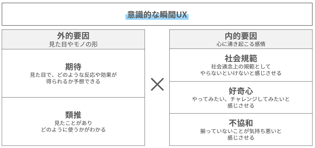 外的要因に由来する「期待」「類推」と、内的要因から来る「社会規範」「好奇心」「不協和」によって、ユーザーの「ついやりたくなってしまう」行動を喚起することが可能です。