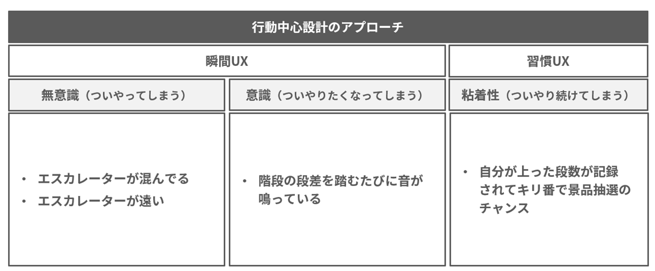 これまで紹介してきた瞬間UXに対して、習慣UXは「ついやり続けてしまう」行動です。階段を上るとスマホ上に自分が上った段数が表示され、50段まで残り3段、達成できたら賞品獲得のチャンスなどと表示されたら明日も上る気持ちになってしまいます。これが粘着質な「ついやり続けてしまう」行動になります。