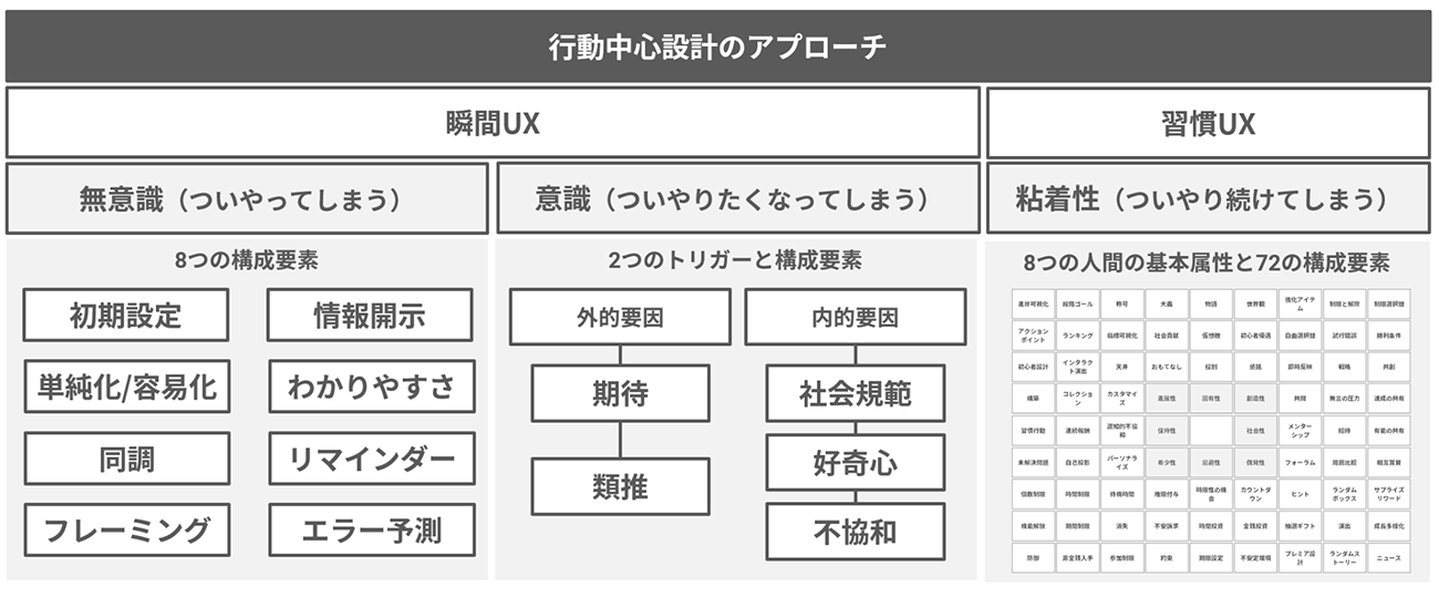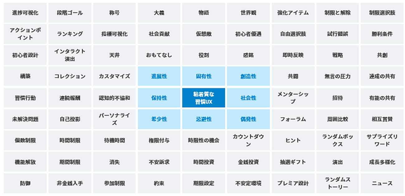「ついやり続けたくなってしまう」行動を喚起する要素として、8つの人間の基本属性と72の構成要素を定義しています。これは、毎日やり続けたくなってしまうゲームのUXを分解し一般化したうえで、再構築・定義したものです。