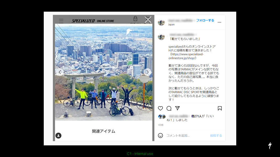 谷口(スペシャライズド):これまで約1,000枚の投稿を紹介してきた結果、お客様が「スペシャライズドに自身の投稿が紹介された!」と喜び、その旨を投稿する流れが生まれ始めたのです。UGC活用施策は元々ECの売上拡大が目的でしたが、お客様とのコミュニケーションの活性化にもつながった点は嬉しい誤算ですね。