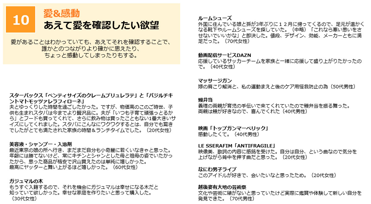 「あえて愛を確認したい欲望」の人が挙げた主要な意見を10ほど抽出したものがこちらです。「心が動いた消費」として購入した商品・サービスで言うと、この欲望を持っている人は、体験やサービス系の消費を多くしている特徴がありました。