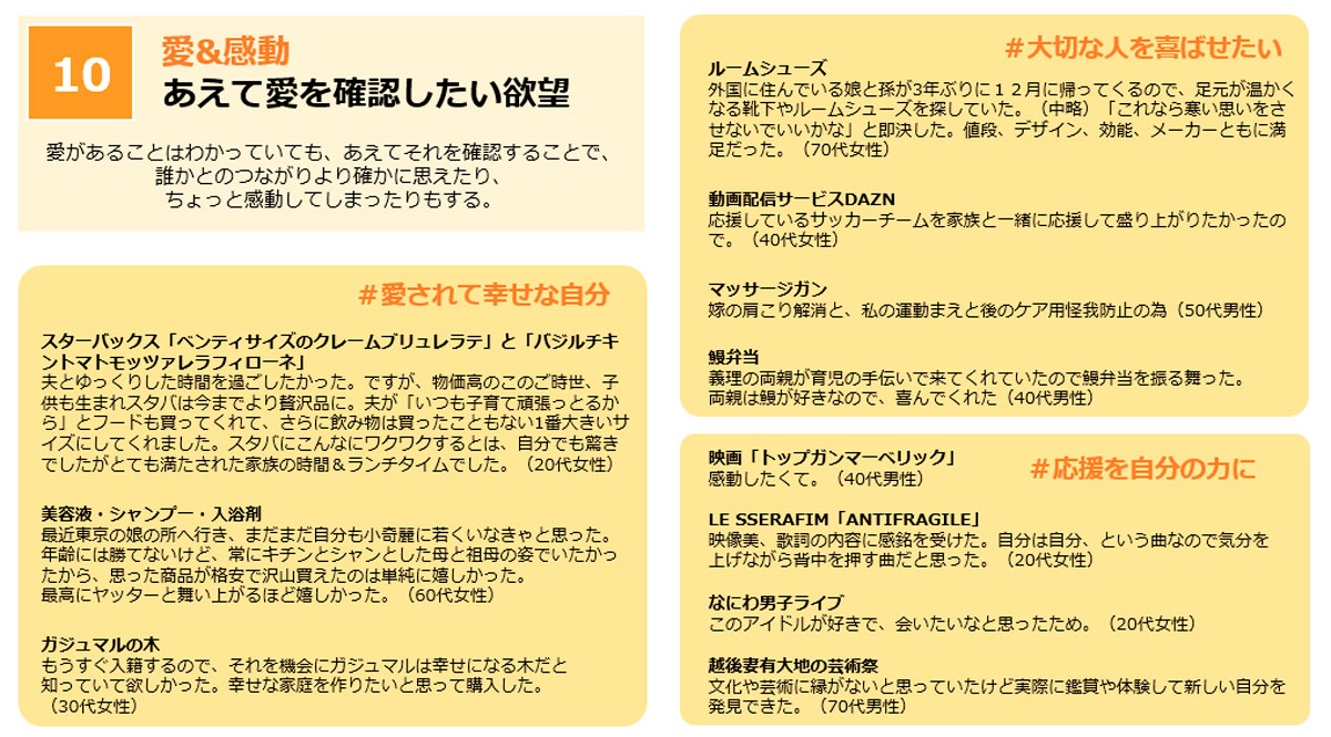 「心が動いた消費調査」内の膨大なフリーアンサーを11の欲望ごとに分析してみると、やはりそれぞれの欲望ごとに異なる消費傾向が見られました。「11の欲望」のうち、一例として「あえて愛を確認したい欲望」の人が、どんな消費をどのような理由で行ったか、見ていただきたいと思います。