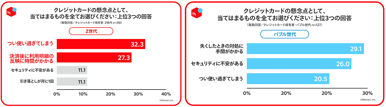 さらに、クレジットカードに対して感じる懸念点について上位の回答を見えると、バブル世代は、「失くした時の対処に手間がかかる」が29.1%、「セキュリティに不安がある」が26.0%となった。