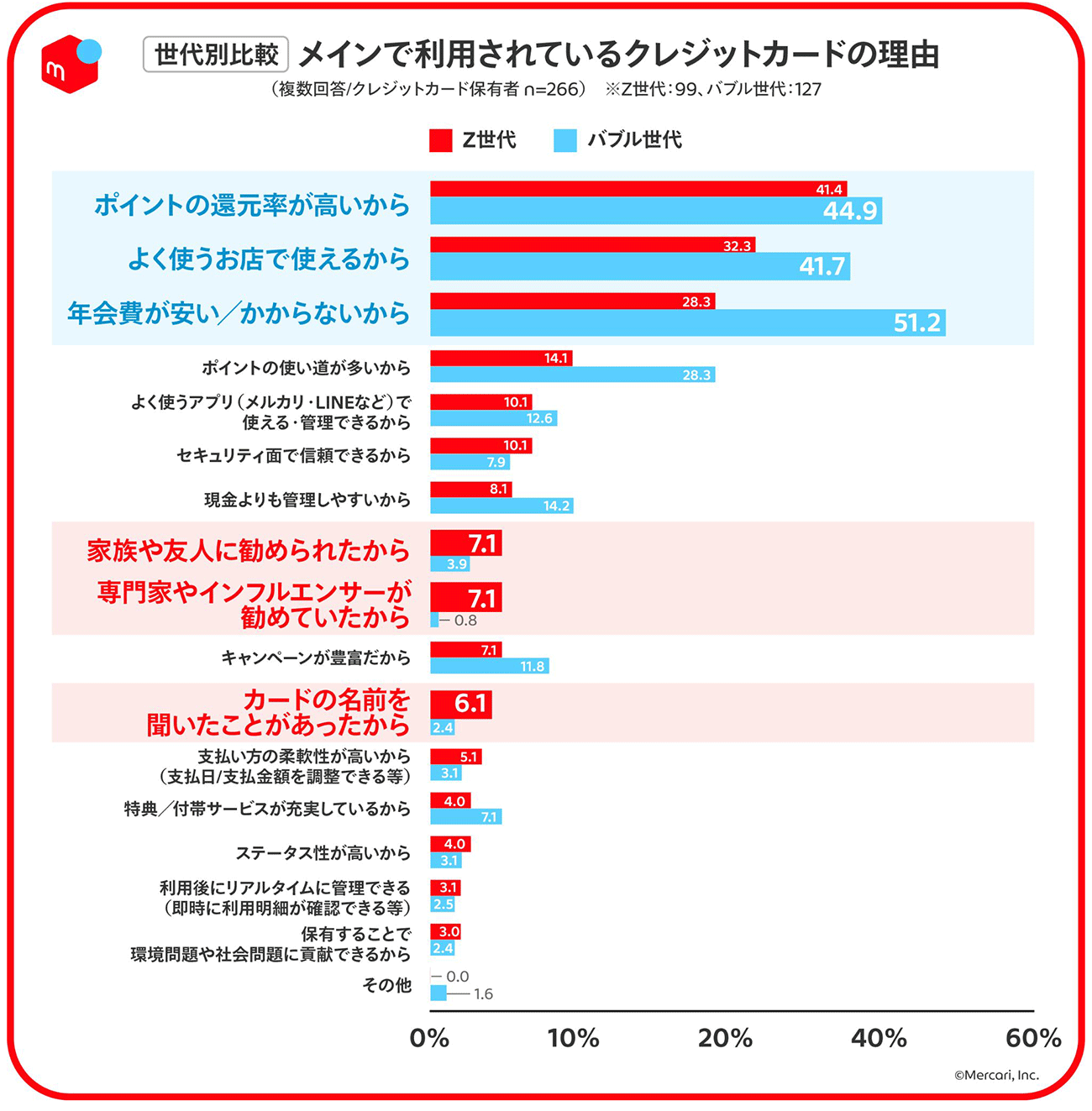 Z世代もこれらの数値は高かったが、その他にも「専門家やインフルエンサーが勧めていたから」や「カードの名前を聞いたことがあったから」といった回答がバブル世代と比較して約3倍またはそれ以上の人が理由として挙げていた