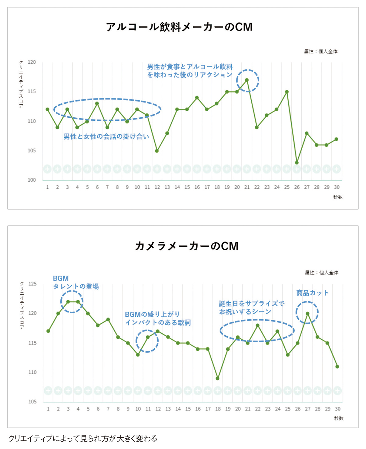 また、あるアルコール飲料のテレビCMも非常によく見られていることがわかりました。こちらも間の入れ方などが上手なのですが、注目したいのは商品を飲むまでのシーン設定です。プロダクトのテレビCMはどうしても商品自体を良く映そうと考えがちです。ドリンクならシズル感をいかに出すかですね。しかし、シーン設定も重要です。たとえば、カラーバックで芸能人が美味しいと伝えるものと、居酒屋で男女が待ち合わせをして美味しい料理と一緒にお酒を飲むものだと後者のほうが注視されます。このように、共感できる舞台設定が離脱を防ぐことがわかってきています。