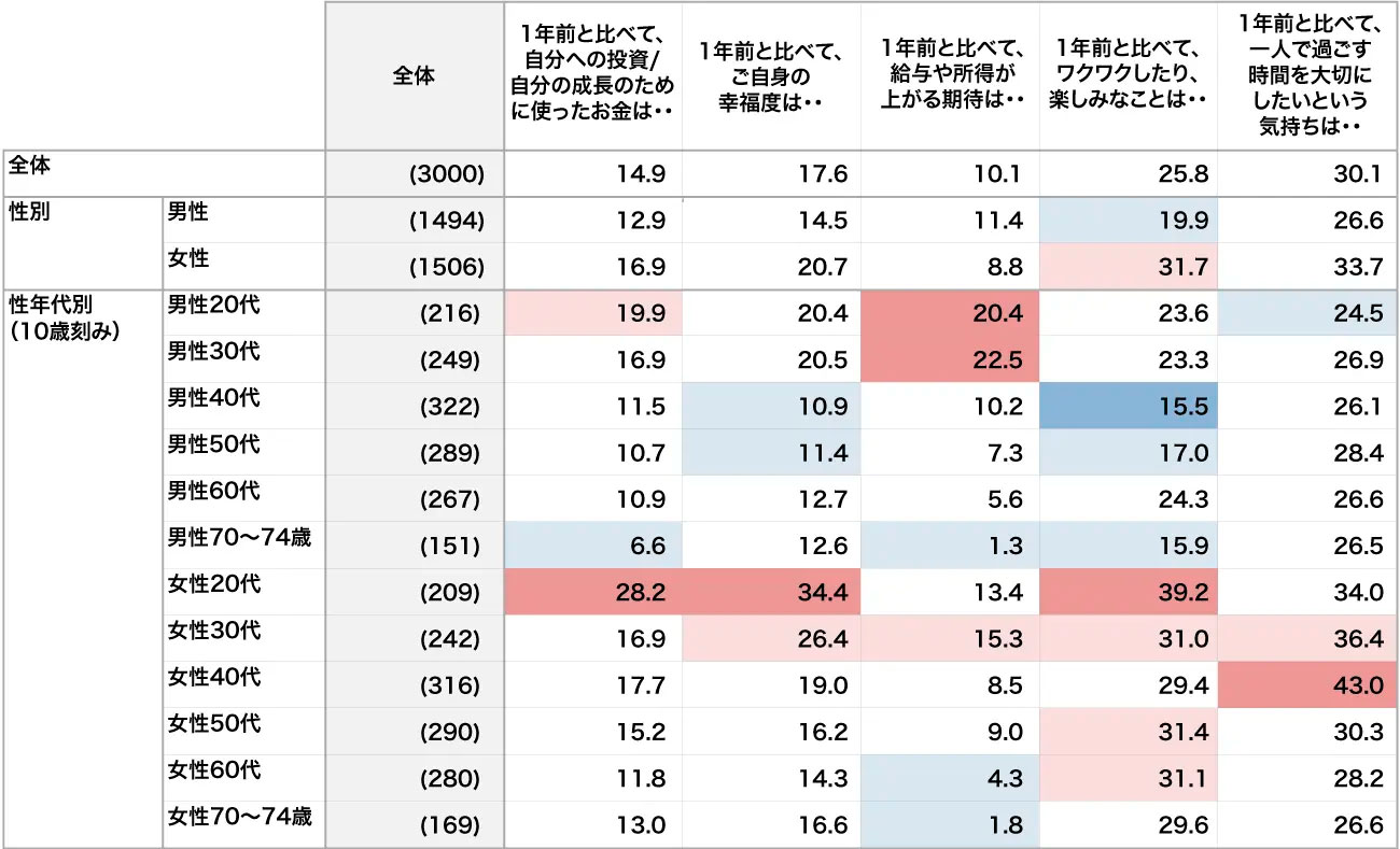 女性20代では、自己投資と幸福度が増していることがわかります。元々消費の好循環に入りやすいセグメントですから、自分に投資して自分をバージョンアップさせることで幸福感も増し、同時にワクワクも感じるという有望な消費者であることがわかります。自己投資、幸福度、ワクワクといった要素もこのセグメントにとっては消費の好循環ファクターとなり得るでしょう。