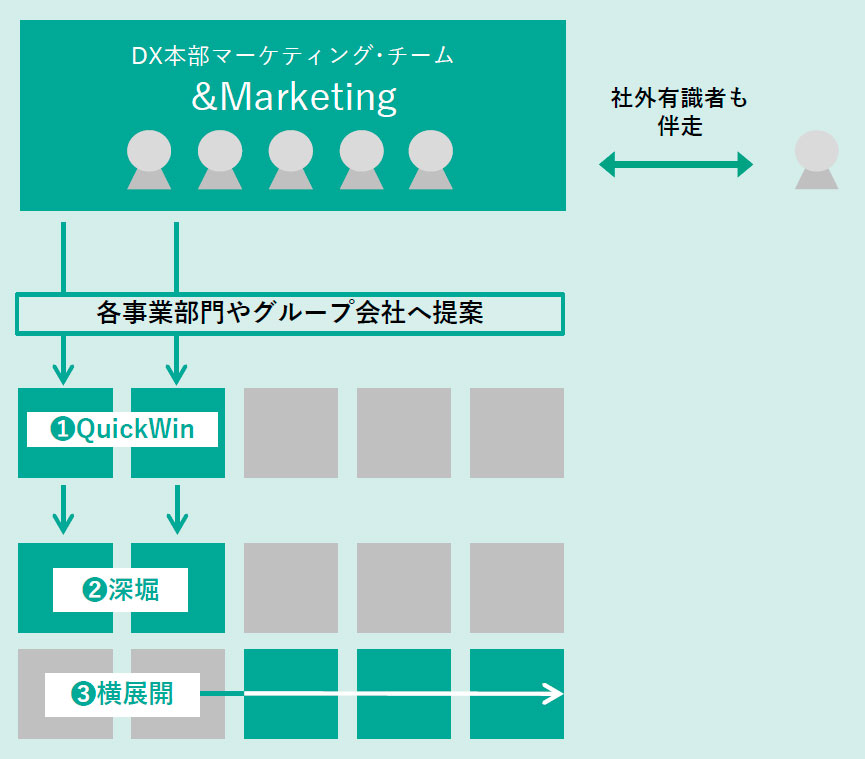 塩谷:最初は、すぐに効果が表れそうな施策を我々のほうから事業部に提案し、その成果が出るまで事業部と一緒に施策を行う形で支援をしています。この取り組みを「Quick Win」と呼んでいるのですが、ここで成功体験を作り、信頼を作ってからMAの導入などより深い取り組みに入っていくという流れです。