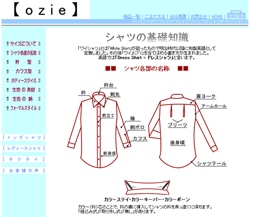 人気コーナー「シャツの基礎知識」。シャツの各部の名称や素材についての解説、