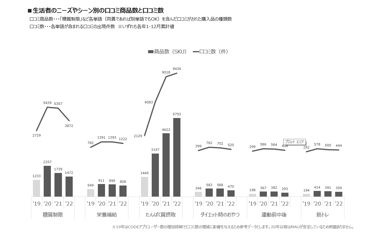 口コミ件数、口コミされている商品数ともに最多の「たんぱく質摂取」はコロナ禍の20年~21年にかけ、健康志向の高まりとともに急拡大しました。体づくりや健康寿命を延ばすためなどあらゆる世代で重要な栄養素として、今後も需要が維持・拡大することが想定されます。