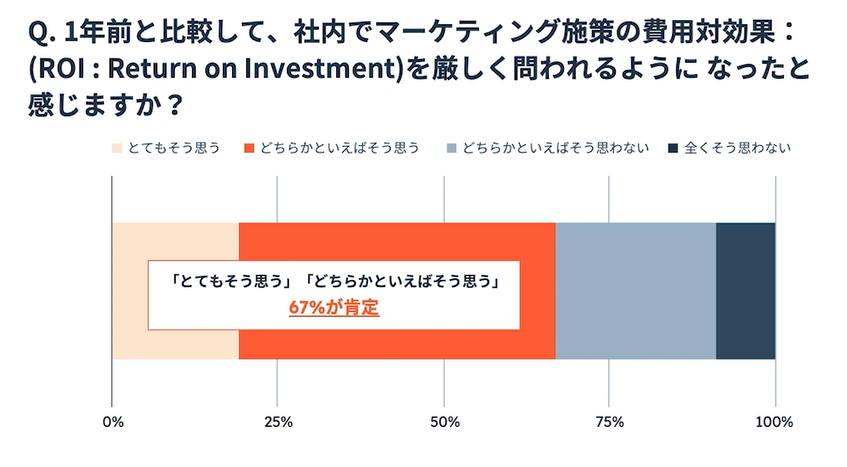 セッションでは、ROI改善に求められる戦略についても触れられた。伊佐氏が示した同社の調査によると、対象となった日本のマーケターのうち67%が、マーケティング施策に関してROI(投資収益率)目標の達成を求められる傾向が強まっていると回答したという。