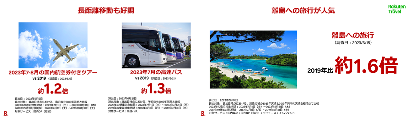 航空券付き国内ツアーの予約を見ると、2023年は2019年と比べ約1.2倍に伸長。高速バスの2023年7月における予約数も約1.3倍になった。加えて、離島への旅行も好調だ。2023年の石垣島・宮古島・奄美大島など離島地域への旅行予約は、2019年比で約1.6倍に拡大した。