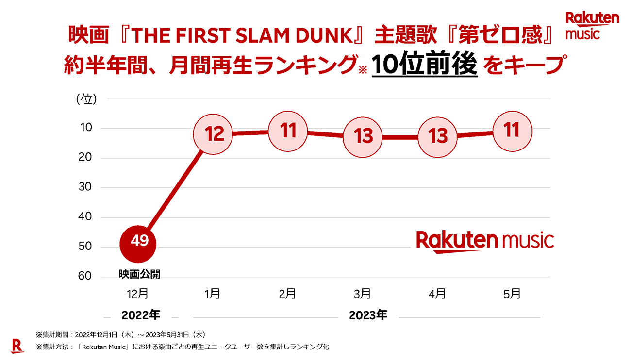 1組目は、京都を拠点に活動するスリーピースロックバンド「10-FEET」だ。同バンドは、国内観客動員数が1,000万人を超えた映画「THE FIRST SLAM DUNK」のエンディング曲「第ゼロ感」を歌う。同曲はRakuten Musicの月間再生ランキングで2023年1月から5月の間10位前後をキープし続け、長期的にユーザーの関心を集めた。