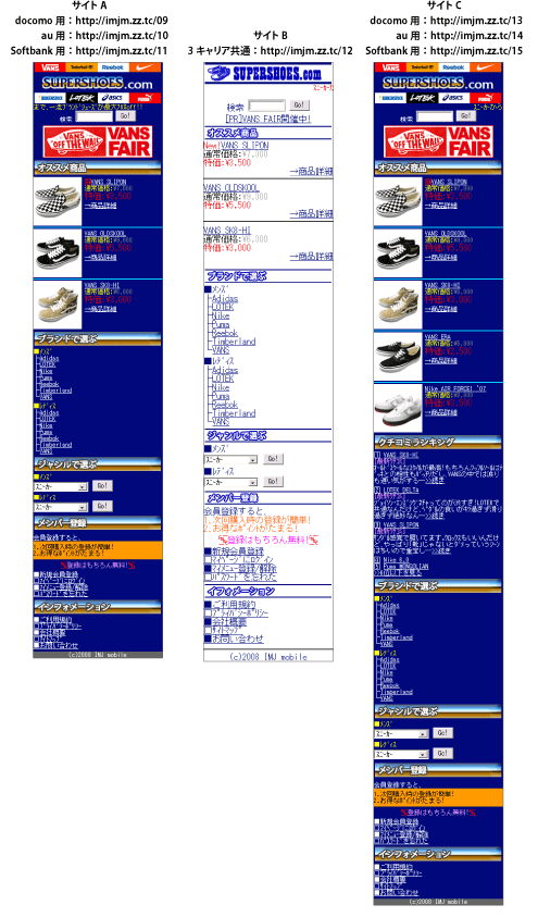 TOPページにおけるデザイン・情報量の違いによるユーザーへの印象の変化を調査するため、画像の使用量が多く適度なデザインを施したサイトA、シンプルなデザインで画像の使用も最小限にしたサイトB、およびサイトAの要素に加え更に情報を付加したサイトCを比較しました。