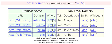他にも、サブディレクトリ名と組み合わせることで http://aki.mo/to/ (マカオのドメイン)などのドメインも提案してくれます。