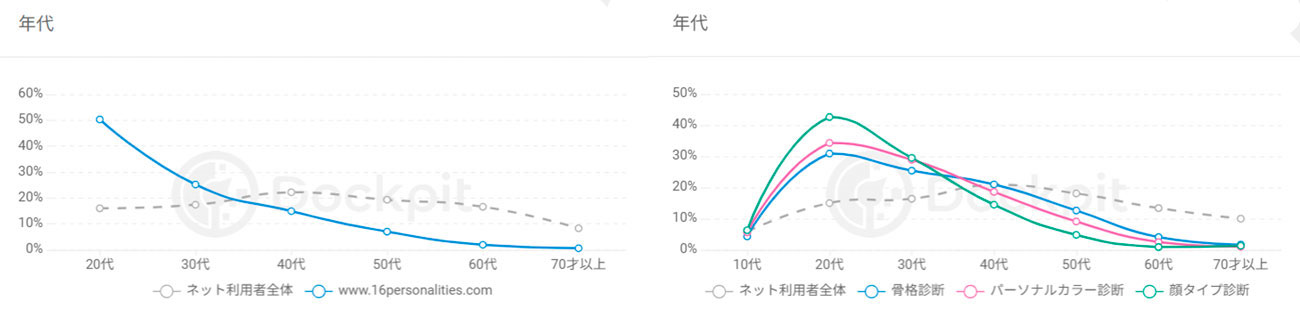 参考として、診断系コンテンツとして有名な「16Personalities」のサイト訪問者と、「骨格診断」「パーソナルカラー診断」「顔タイプ診断」の検索者の年代を見てみると、いずれも20代の割合が顕著に高くなっています。