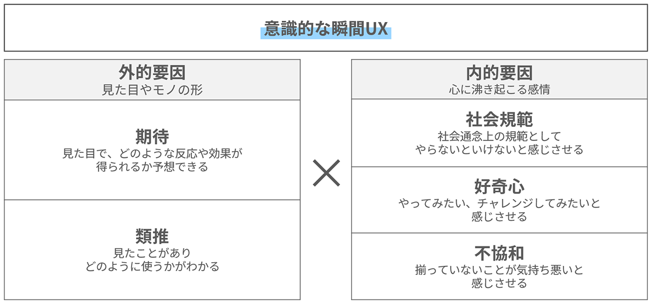 意識的な瞬間UXでは、これら2つの外的要因と3つの内的要因の要因を組み合わせて、やりたくなるアイデアを考えていきます。