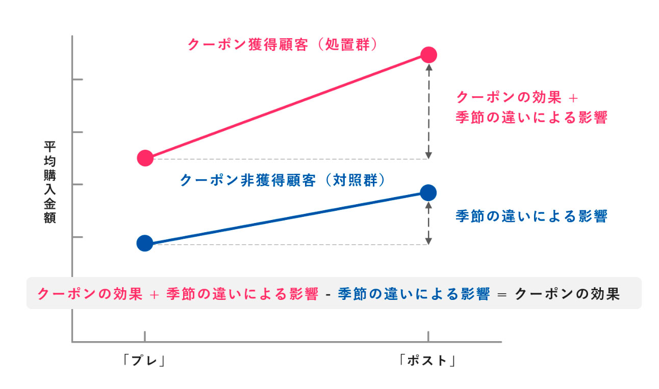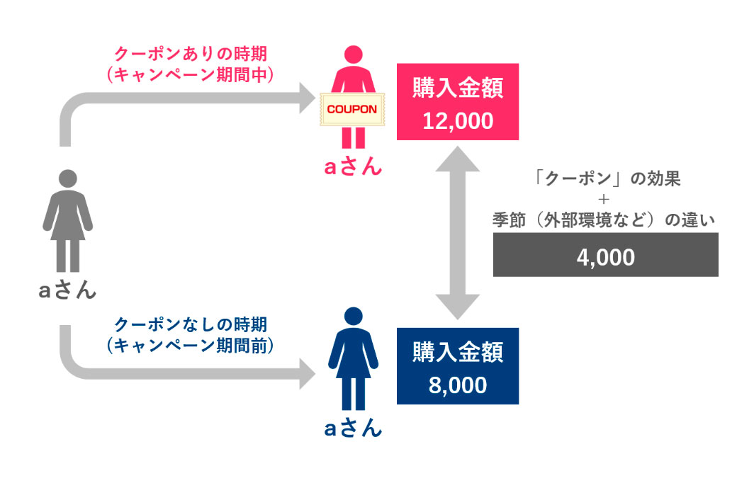 販促キャンペーンは、対象商材への需要が高い時期に実施されることがあります。その場合、施策期間前の購入金額を施策期間中の「クーポンなしの場合」の購入金額としてみなすことはできません。なぜなら、キャンペーンの時期は、同時に顧客の購買意欲が高い時期でもあるので、クーポンがなかったとしても、施策期間前より購入金額が多くなる可能性があるためです。つまり、「処置群での施策前後の差分」は、施策の効果に加えて、季節による影響を足したものになっていると言えます。