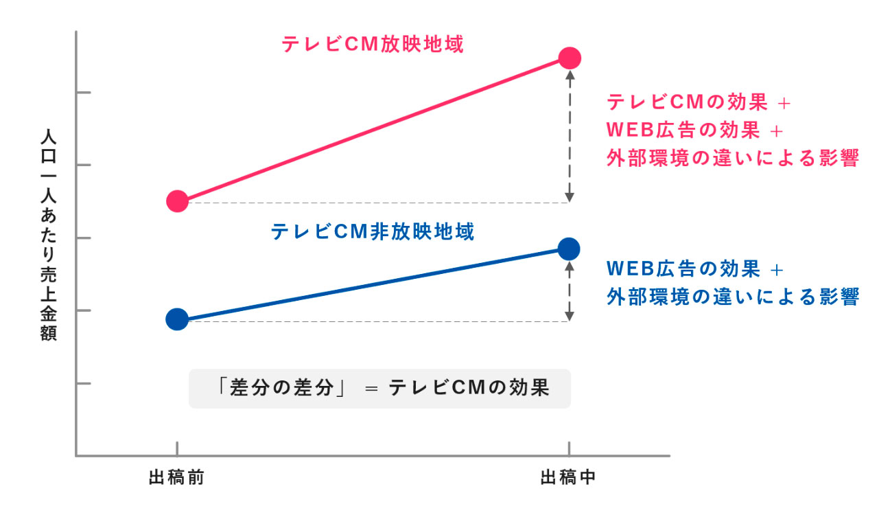 エリア単位の売上データは、POSデータなど、時系列でその変化を追えるものが多く、放映地域・非放映地域のどちらも広告出稿前後の売上金額の追跡が可能なため、差分の差分法が適用できます。平均値の引き算を繰り返すだけの手法であるため、粒度も問題になりません。
