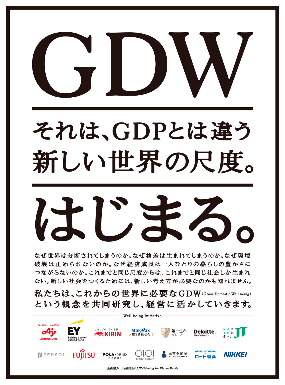 統合諸表を開発するそもそものきっかけを作った企業コンソーシアム「Well-being Initiative(※1)」も今年で発足から3年目を迎えました。Well-being Initiative では、「GDW(Gross Domestic Wellbeing:国内総充実)」を開発・提案しているのですが、ちょうど先日、カンヌライオンズの「クリエイティブ・ビジネス・トランスフォーメーション」部門で、Well-beingInitiativeが金賞を受賞しました。GDPという既存の社会の物差しにGDWも加えることによって、社会構造を変えていこうとしているWell-being Initiativeの活動が海外でも評価された形です。
