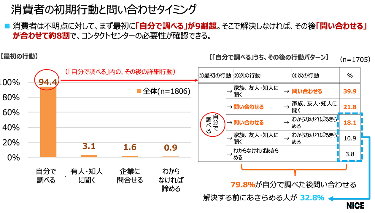 商品について調べている途中で、疑問や不明点が生じた場合の対処法をスクリーニング(事前)調査の段階で消費者に尋ねたところ、94.4%の人が「自分で調べる」と回答。さらにその中で、次のアクションとして「企業に問い合わせる」と回答した人は計79.8%に。つまり、全体の約7割が「自己解決→問い合わせ」というステップを踏むことが判明した。