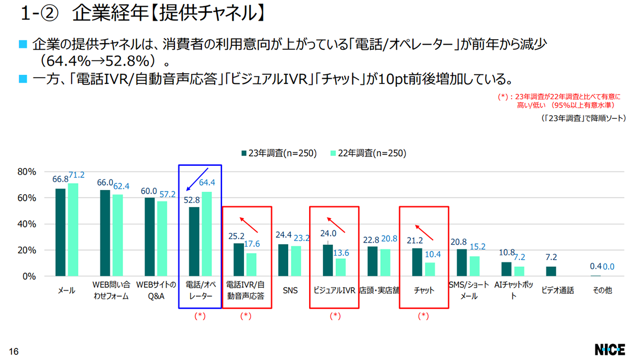 次に、企業側が提供している問い合わせチャネルの実態を見てみよう。企業に対して、提供チャネルを回答してもらったところ、最多回答は「メール(66.8%)」に。また、2022年の調査結果と比較して最も減少したのは「電話/オペレーター」で、11.6ポイント減少。一方、「電話IVR/自動音声応答」「ビジュアルIVR」「チャット」はそれぞれ10ポイント前後、増加した。