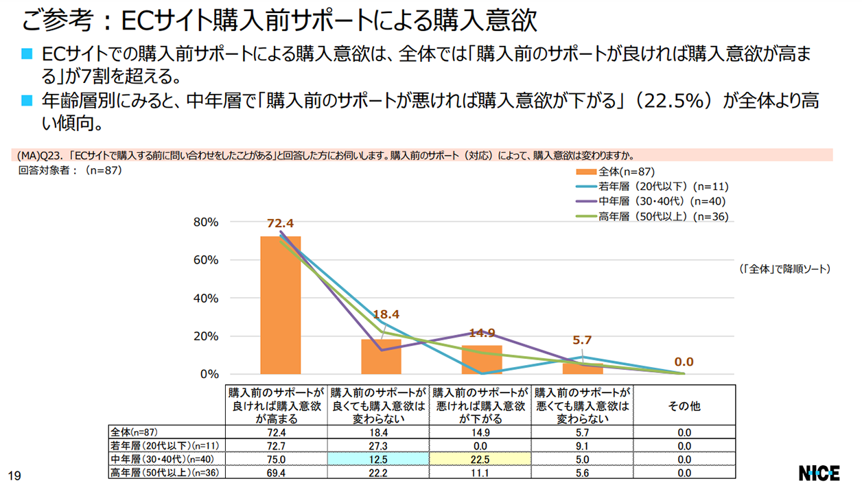 では、こうした問い合わせサポートの有無が、実際の消費行動にどのような変化をもたらすのか。ECサイトでの購入を例に消費者に質問。有効回答数87のうち、「ECサイトで商品を購入する前のサポートが良ければ購入意欲が高まる」と回答した人の割合は72.4%だった。また、「購入後のサポートの質が良ければ継続利用の意向が高まる」の回答割合も66.1%と、過半数を占めた。