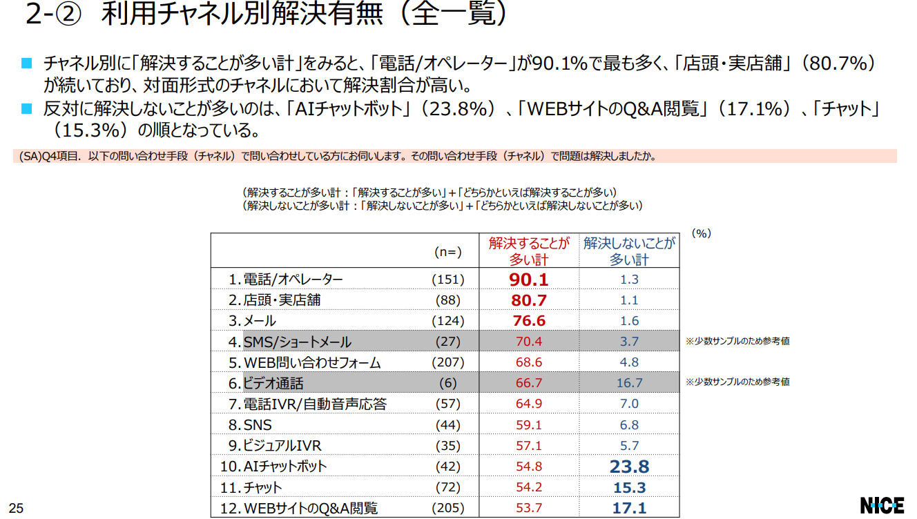 次に、どのチャネルが最も疑問や不明点の解消につながったかを質問。その結果、トップ回答は「電話/オペレーター(90.1%)」に。2番目以降に「店頭・実店舗(80.7%)」、「メール(76.6%)」が続いた。反対に、解決が難しかったチャネルのトップ3は「AIチャットボット(23.8%)」、「WebサイトのQ&A閲覧(17.1%)」、「チャット(15.3%)」だった。