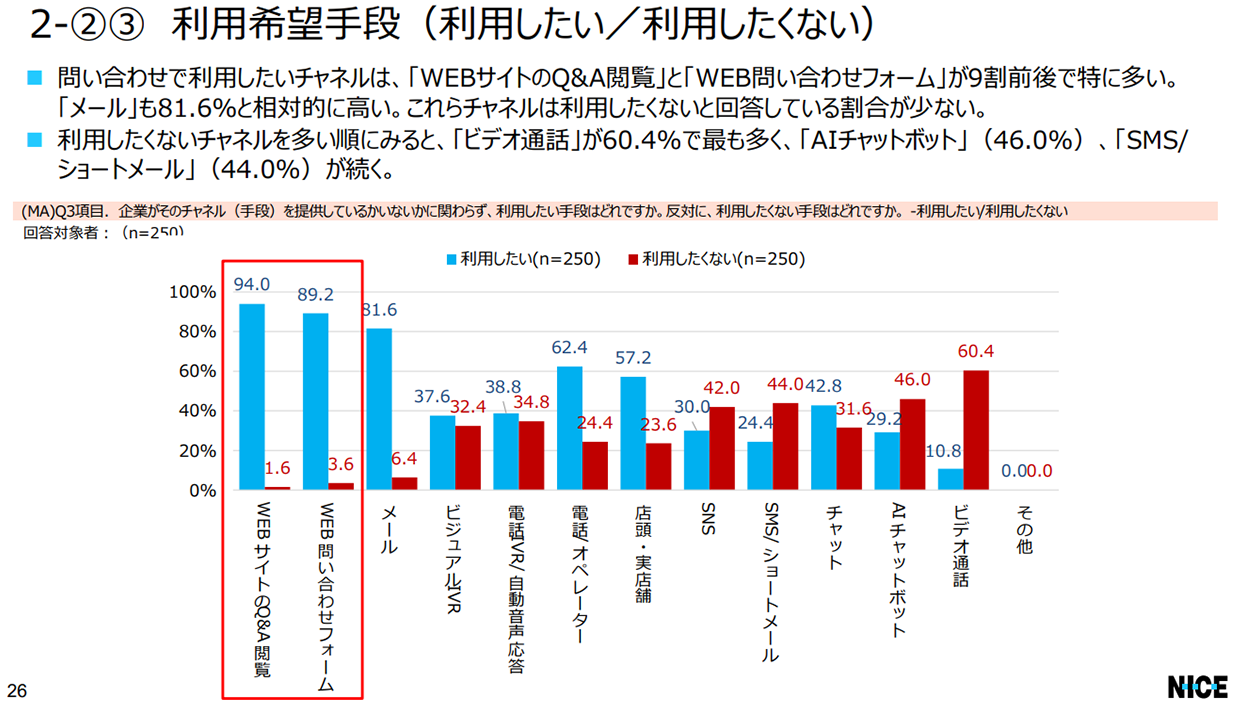 転じて、本調査で消費者にとって“利用したいチャネル”と“利用したくないチャネル”それぞれ選んでもらったところ、「WebサイトのQ&A閲覧」は“利用したいチャネル”として94.0%とトップ回答に。一方、“利用したくないチャネル”の最多回答は「ビデオ通話(60.4%)」だった。
