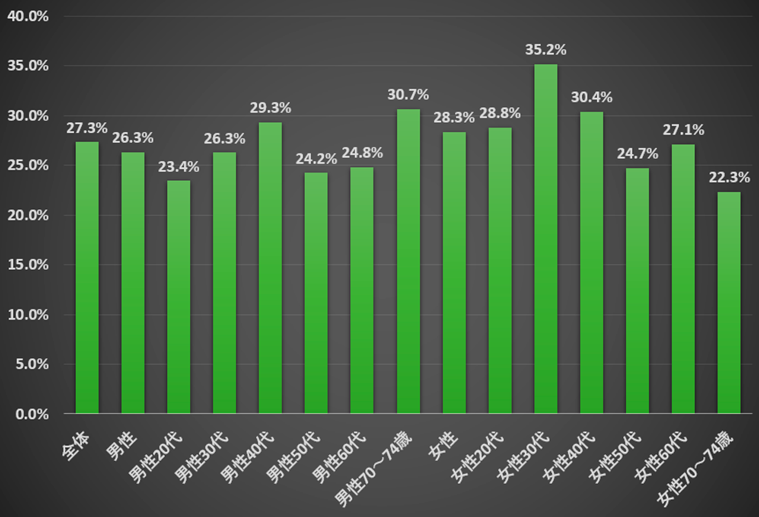 続いて、「1年前と比べて、欲しいものやしたいことを我慢すること」が「増えた」と答えた方の割合を性年代別に示したものがこちらです。全体で27.3%の方が1年前より我慢することが増えたと回答しており、コロナの五類化を機に消費が活発化していると単純には言い切れないことがわかります。