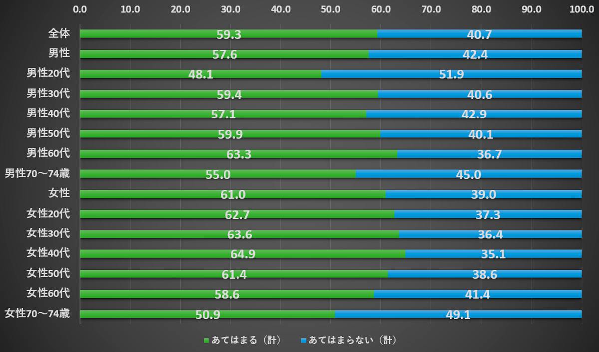 先ほどの表を男女別で見ると、興味深いことが見つかりました。若年女性、特に20代(75.6%)・30代(76.9%)は、4人に3人が「たくさんある」「まあまあある」と回答しており、全年代で比較しても高い数値となっています。ところが、男性は年代別で大きな差はなく、全体的に男性のほうが具体的な欲しいものやしたいことなどが少ないことが読み取れるのです。