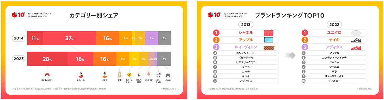 「10年前はアプリ上での取引全体のうち、約半数が洋服などのアパレル商品でした。しかし、最近では推し活のようなエンタメホビーカテゴリーでの取引量が増加しています。加えて、ブランドの傾向を見ても、10年前は高価なハイブランドが取引量の上位に並んでいました。しかし、最近ではお手頃な価格帯のカジュアルブランドに置き換わっています。これらは「メルカリ」を使って簡単に不要品を売るという消費行動が、商品カテゴリーやブランドでも多様化しており、日常の様々なシーンで利用されている結果だと考えています」(前川氏)