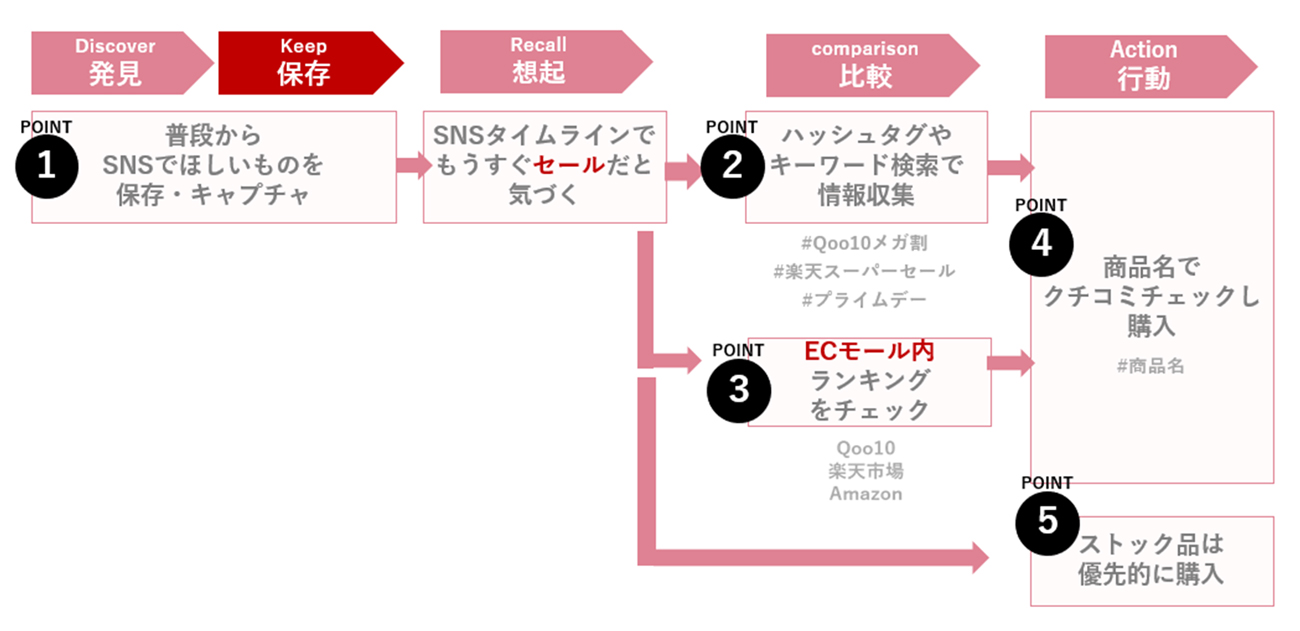 では具体的に、「メガ割」を含むECモールのセールイベントをどのように攻略していけばいいのかを、キープ消費の具体的な行動導線に則って5つのポイントにまとめました。