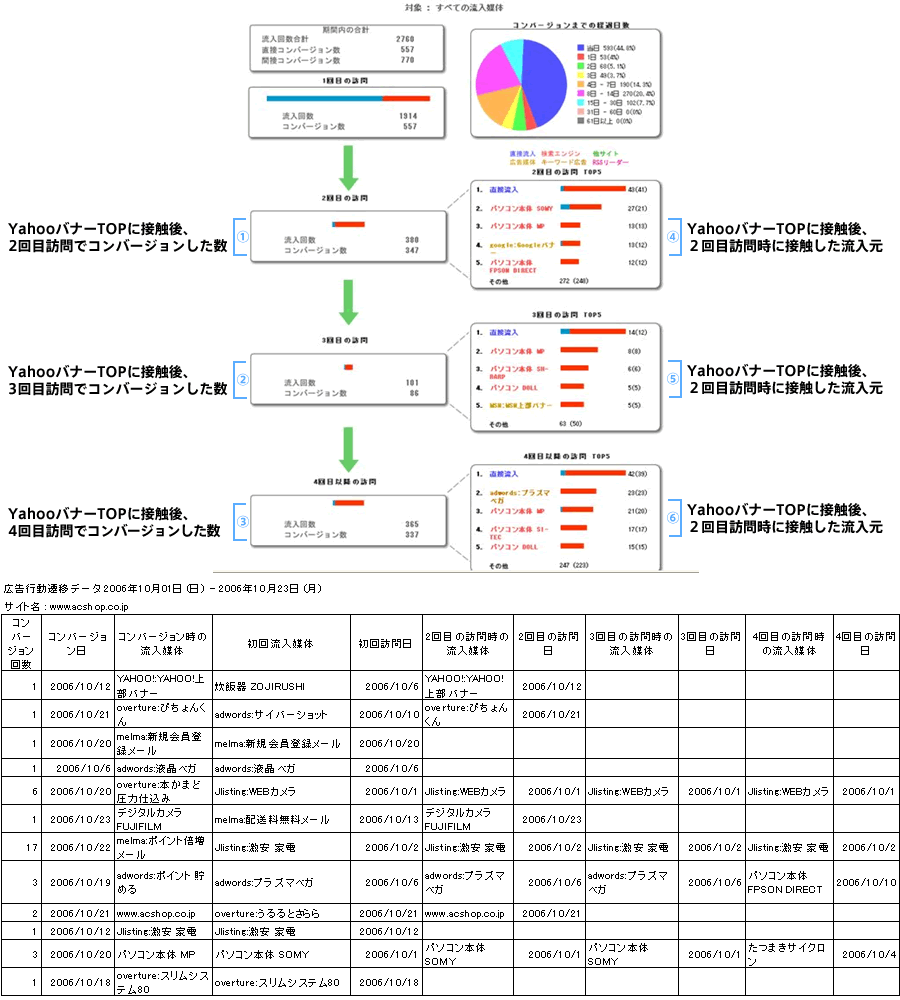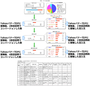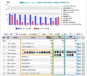 例えば、バナー広告やフラッシュ広告では、掲載広告からの認知効果と広告認知から成果に結びつくまでの時間(日数)が有効な検証項目であり、それにより出稿メディアからの誘導力とその回収期間に応じた投下予算を設定することが可能です。