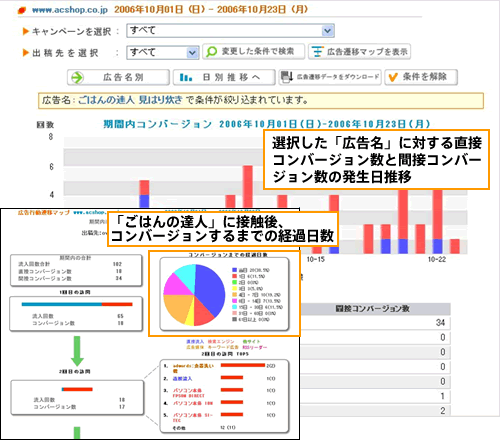 行動ターゲティングを用いてユーザの一連の行動過程における広告接触をポストクリック効果として検証することにより、広告認知からの誘導頻度と成果に至るまでの時間を算出し、費用対効果を最大化する投下コストを割り出すことが可能となります。言い換えると、広告ポストクリック効果とは、「どのメディア(媒体)にいくら費用を投下すれば、効果があるのか?」を見つけることなのです。 画面は、アクティブコア社の行動ターゲティング分析サービス「ac cruiser ASP」にて提供されるレポート機能の例を示します。