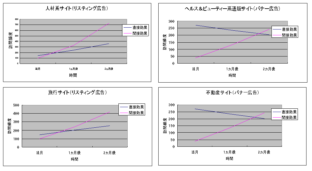 実際の運営サイトにおいて行動ターゲティングに基づいた広告ポストクリック効果を以下に説明します。サイトの分野や取扱製品の購買サイクルにより間接的効果と直接的効果の2つの曲線が交わるタイミング(時間)は異なりますが、間接的効果は同様に増加することがわかります。広告認知による間接的な効果が顕著に現れるサイトの特徴としては、購買サイクルに比較的時間を要する商品や取扱商品数が多い人材関連や旅行関連や不動産関連のサイトになります。