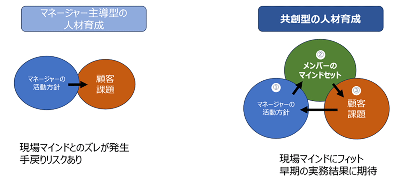 デジマ人材を育成する上で必要なのは、自ら考え行動する人材です。マネージャー視点と現場社員の両方のマインドセットが整った「共創型」の育成をすることが鍵になります。