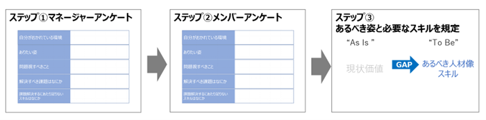 次に、メンバーに対して、アンケートやディスカッションを通じて「自分たちがどうなりたいか」を考えてもらい、解決すべき課題やあるべき人物像を考えてもらいます。