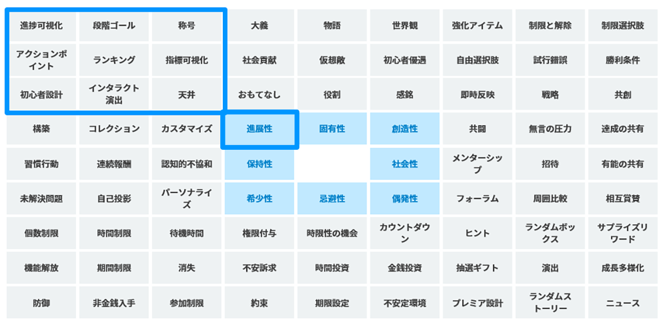 先ほどの「ついやり続けたくなる」を促す人間の8つの基本属性を踏まえ、それらを訴求する具体的な手法(要素)を解説していきたいと思います。行動中心設計では、人間の8つの基本属性に対しそれぞれ9つの要素を定義しています。合計で8×9=72の要素が存在し、すべて説明することは文字数の都合上難しいため、例として「進展性」の要素を取り上げて解説します。