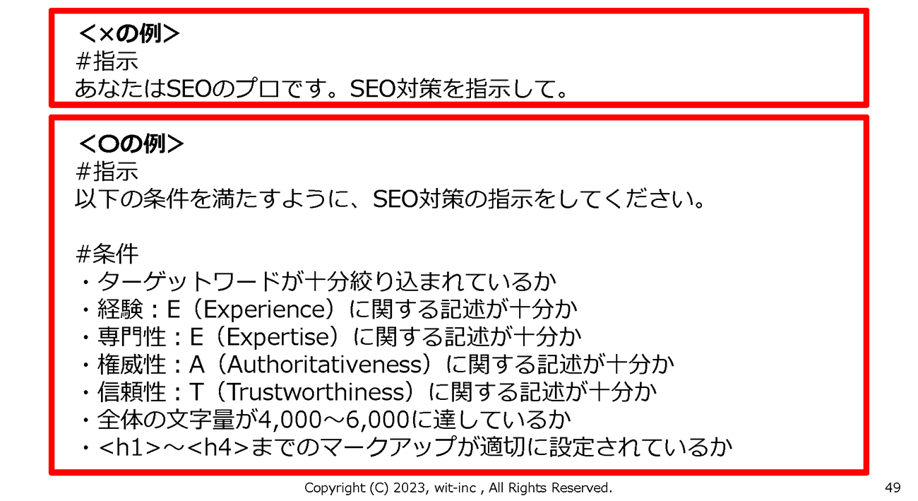 この方法なら、ChatGPTと何度も会話を重ねることなく一発で使えるアウトプットが引き出せるという。このように狙った文章を書いてもらうアプローチは、Webサイトに掲載するテキストや問い合わせ対応のたたき台、SEO記事などの作成に応用できる。