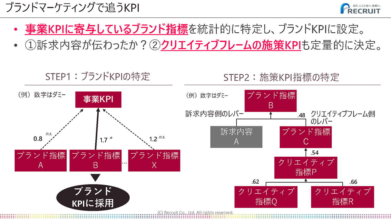 ホットペッパービューティーではブランドKPI指標の向上だけでなく、ブランド施策により事業KPIの向上にどれだけ寄与したかを統計的に特定している。またブランドKPIを最大化させるために、どんな施策KPIを設定すればいいのかという点も、統計的かつ定量的に分析して決定している。