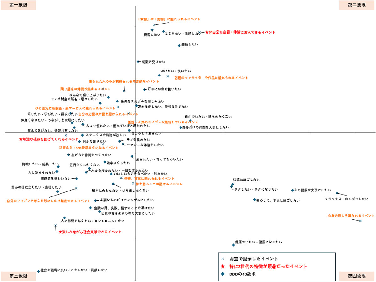 魅力を感じたイベントついては、その理由をDDDの43欲求から選んでもらいました。そして、各イベントとそれに期待する体験価値(欲求)との関連を『コレスポンデンス分析』という手法で分析しました。
