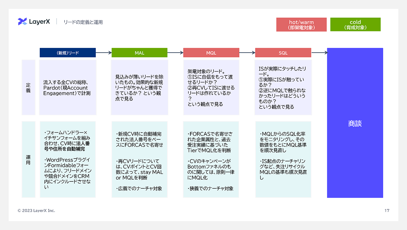 ここからは、各社が設定しているリードの定義を深掘りする。LayerXでは、各フェーズのリードを次のように定義しているそうだ。