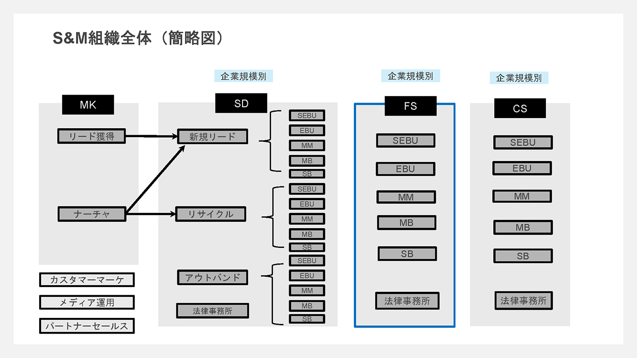 LegalOn Technologiesでは、組織/個人のペルソナ詳細とその判定条件、uSonarで調べたリスト数を基にTierを細かく設定している。さらに、このTierは組織体制にも反映されているという。どういうことかと言うと、見込み顧客の企業規模別に専門チームを組織し、対応にあたっているのだ。