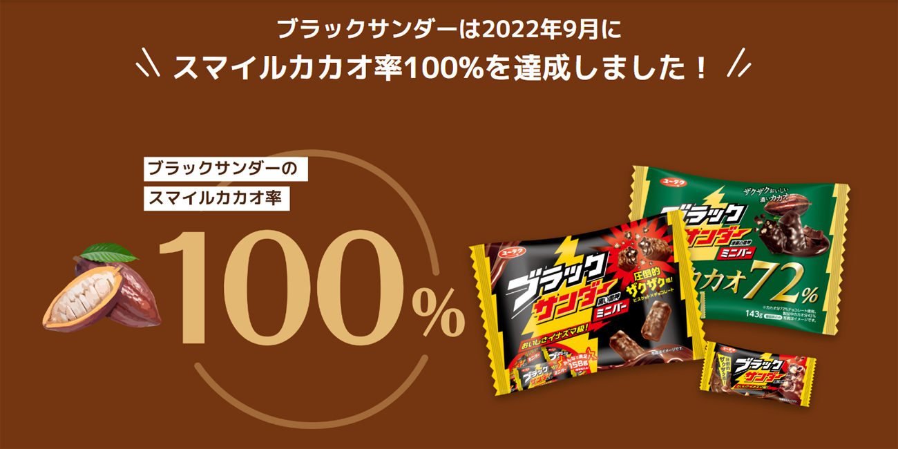 牧:2022年9月に、ブラックサンダーが使用するカカオ原料が100%児童労働に配慮したものに切り替わったことを記者会見の場で発表しました。その際にかなり多くのメディアで取り上げていただきました。2022年8月~2023年7月までの1年間で、ブラックサンダーブランドに次いで、2番目に多く取り上げられるトピックスとなりました。