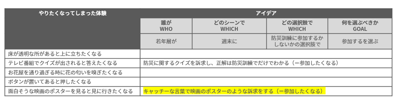 また別の経験として「おもしろそうな映画のポスターを見ると観に行きたくなる」にかけ合わせると、一見して防災訓練とわからないような映画風のポスターで告知をすることで、行動変容を促せそうです。