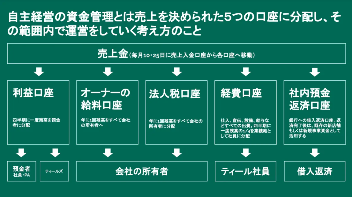 ここまででHOLIS式ティール組織の凄さは十分に伝わったかもしれないが、ここからが真骨頂である。HOLISグループでは、パート・アルバイトを含めた全従業員が社内に預金する権利を持つ。この社内預金によって、企業は銀行への返済時期を早めたり、新規事業へチャレンジしたりできる。預金者は預けた金額とそれによって生まれた利益に応じて、利益口座の一部を分配金として四半期に一度受け取ることができるのだ。