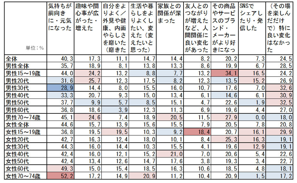 具体的には、心が動いた買い物をした人(2,548人)を分母にすると、そのうち40.3%が「最も心が動いた買い物をきっかけに気持ちが前向きに・元気になった」と回答。スコアをブレークダウンすると、男性(35.7%)より女性(44.6%)のほうが高いことから、性別の違いが顕著に見られました。また、年齢別で見ていくと、男性では30代のスコアが低く、女性では70~74歳のスコアが高いことも見て取れます。