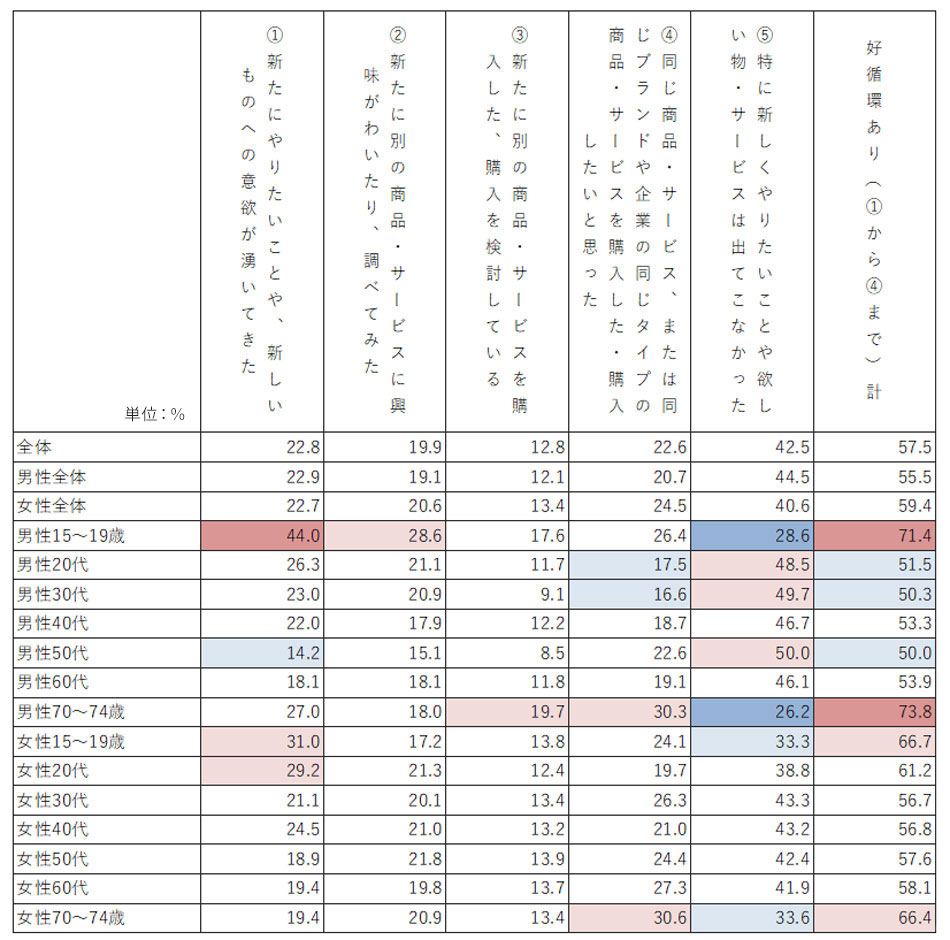 DDDでは、消費で心が前向きに動いたことで新たにやりたいことが出てきたり、別の商品サービスへの興味や検討、リピート購入の意向が高まったりすることを総じて「消費の好循環」と定義しています。実際、図表3を見ると、その好循環が起きた人のスコアは全体で57.5%をマークしており、心が動いた消費をした人のうちおよそ6割弱に好循環が起きていることがわかりました。