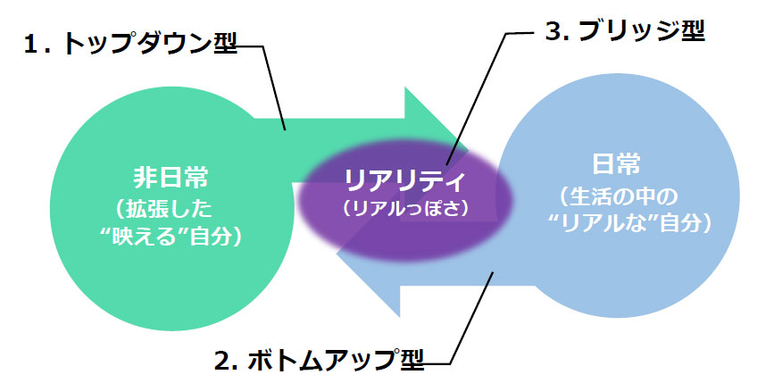 【欲望トレンド1】リアリティ(リアルっぽさ)への収斂:“映え”や“盛り”の常態化による疲れが生じ、リアル(日常)でも非リアル(映え・盛りなど非日常)でもない「作為的なリアリティ(リアルっぽいもの)」に欲望が寄っていく。